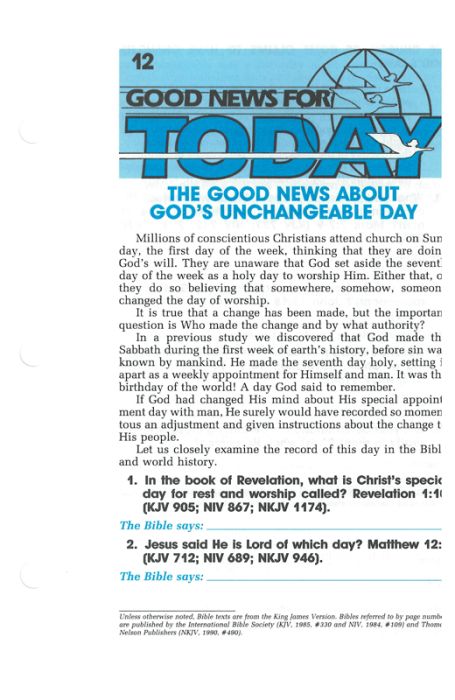 Description / Good News For Today Bible Lesson 12 - God's Unchangeable Day (Pkg of 100)
